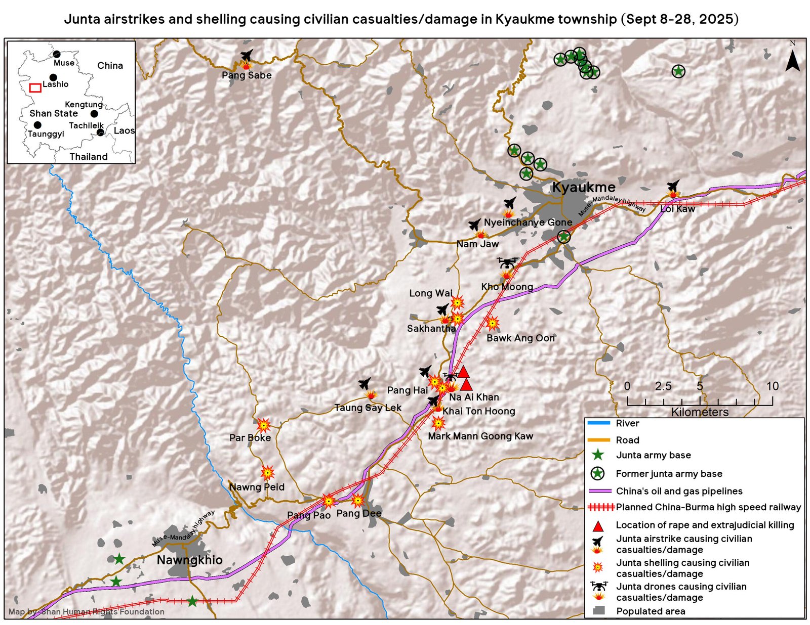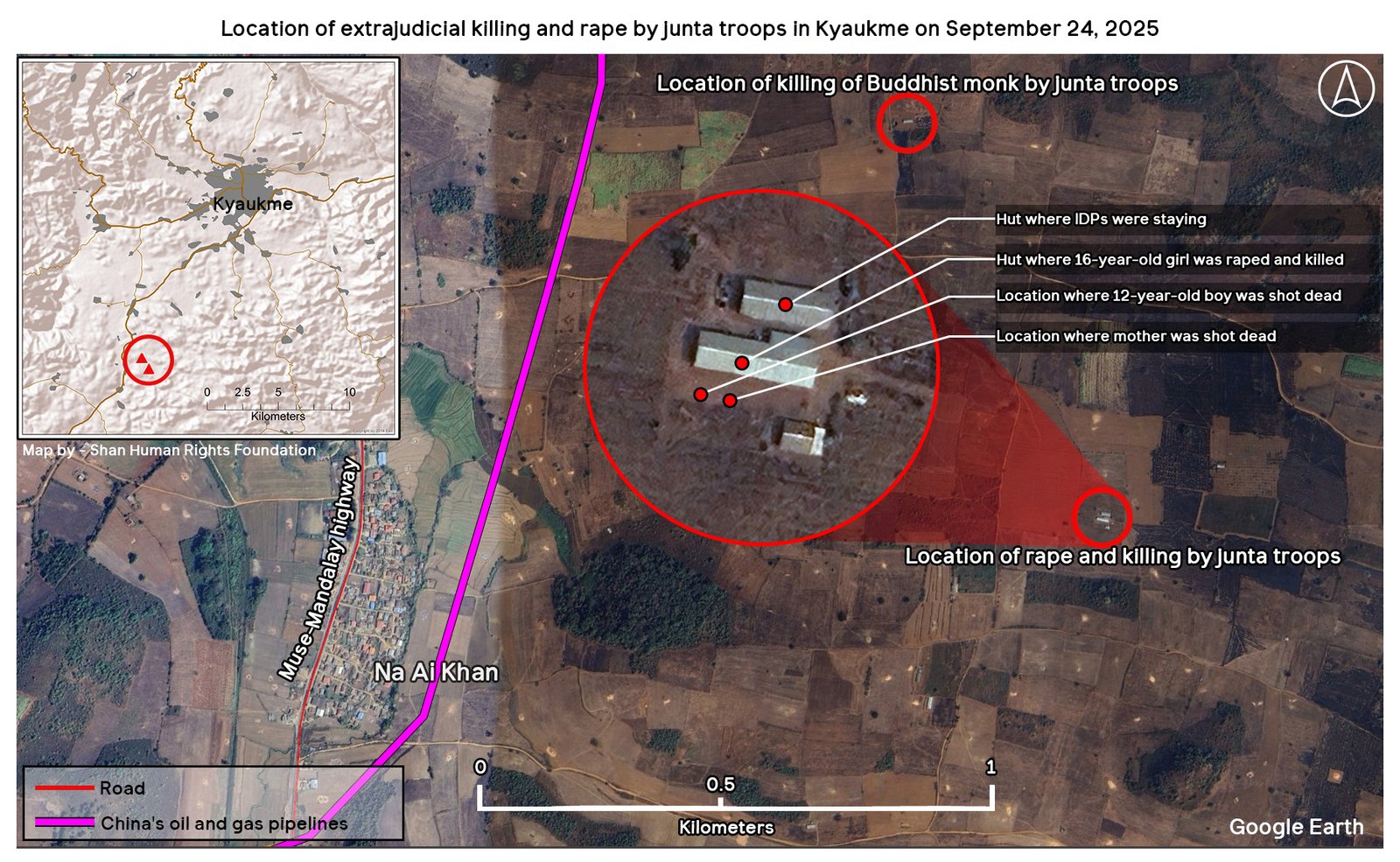 On 24 September 2025, troops of the Burmese military regime killed four civilians sheltering in farm huts about 10 kilometers from Kyaukme town, including a sixteen-year-old girl who was also raped. The troops were taking part in a large-scale operation to retake Kyaukme from the Ta’ang National Liberation Army, causing the displacement of over 10,000 villagers since August 2025.